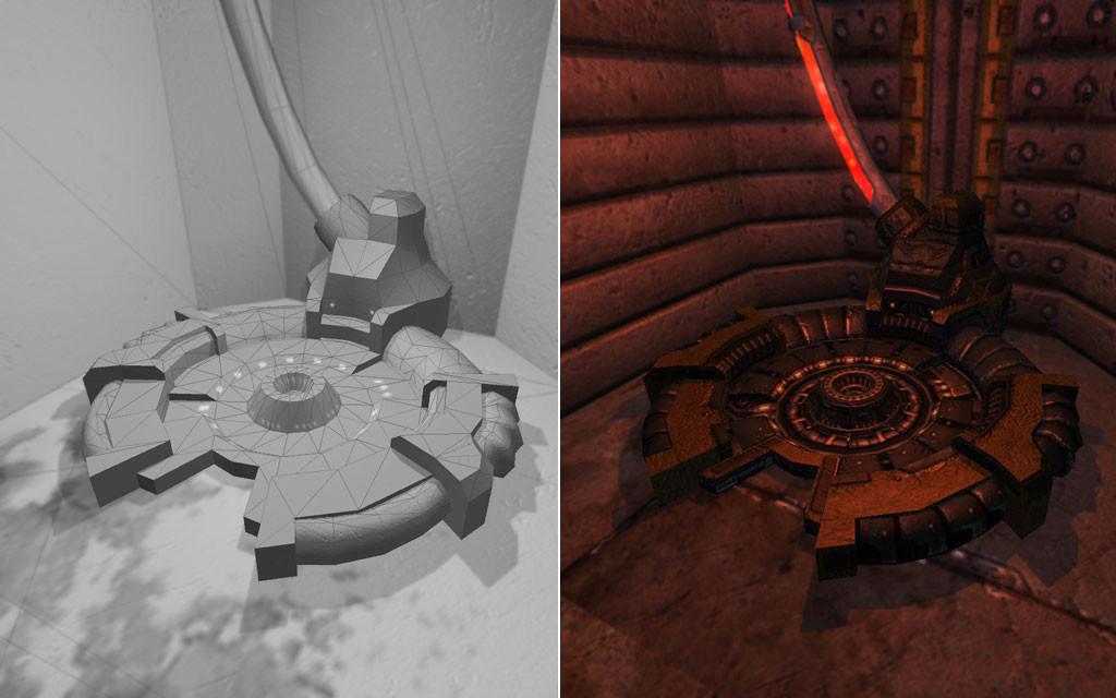 Fully embracing the Quake heritage, I concepted and modelled the gameplay blockout for the Strogg Slipgate teleporter. Once the gameplay tweaks were sorted, the model was handed over to the art team to create the final high poly game asset.